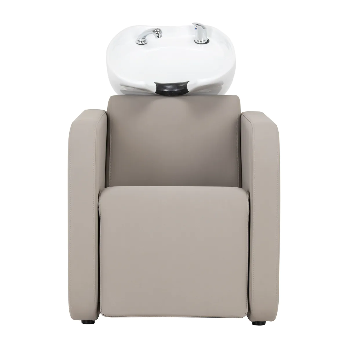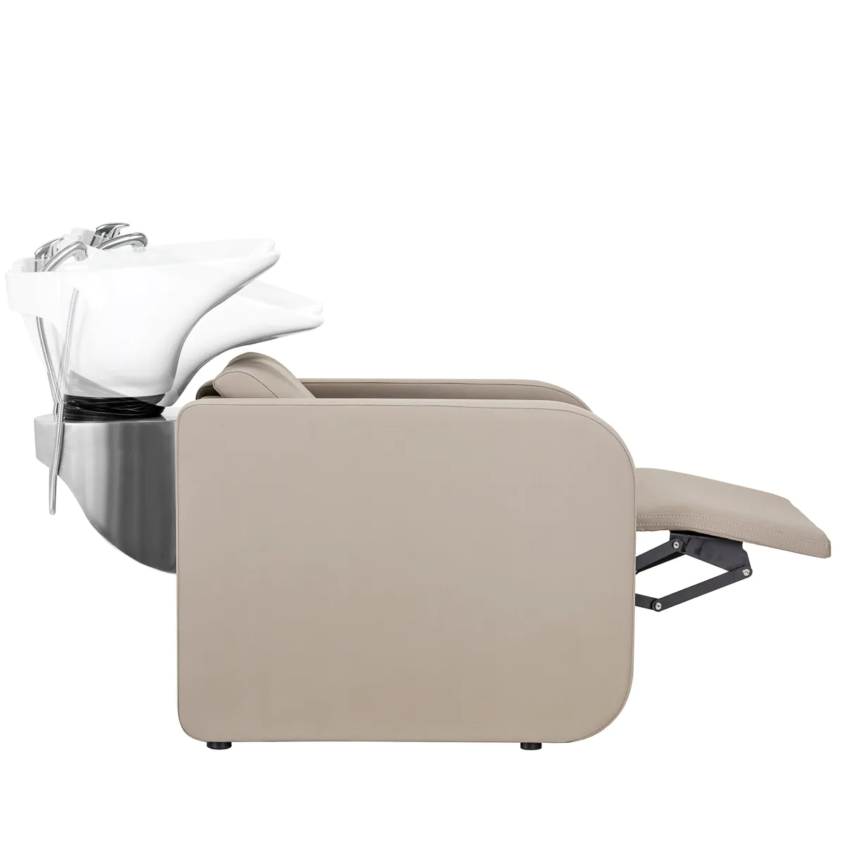 Prilagodba potrebama Električno aktivirani oslonac za noge omogućuje ergonomski položaj prilagođen potrebama klijenta. To smanjuje napetost mišića, osiguravajući udobnost čak i tijekom duljih tretmana. Kut nagiba kontrolira se pomoću gumba smještenih na naslonu stolice , podižući ili spuštajući oslonac za noge. Ovo rješenje ne samo da pruža iznimnu udobnost već i visoku funkcionalnost, osiguravajući da autopraonica savršeno ispunjava očekivanja čak i najzahtjevnijih korisnika .  Elegantni umivaonik za jednostavno korištenje Dubina keramičkog umivaonika u nijansama bijele omogućuje udobno i učinkovito obavljanje širokog spektra frizerskih usluga , sprječavajući prekomjerno prskanje vode i proizvoda korištenih tijekom tretmana. Korišteni materijal čini umivaonik izdržljivim, otpornim na promjenu boje i ogrebotine te vrlo jednostavnim za održavanje čistoće. Konturirani rub i nagnuti naslon pružaju potporu i udobnost tijekom pranja kose, a zahvaljujući udobnom crnom plastičnom poklopcu, klijenti se neće osjećati neugodno zbog hladne keramičke površine. Optimalni sadržaji Jedinica za pranje opremljena je miješalicom , što omogućuje stalan pristup toploj i hladnoj vodi. To omogućuje jednostavno podešavanje temperature prema željama klijenta . Namjensko mjesto za vješanje slušalice olakšava rad, a kromirani čep sa posebnim cjedilom omogućuje kontrolu protoka vode i održavanje visokih higijenskih standarda u salonu. Priključak za vodu nalazi se unutar stupa ispod sudopera, što omogućuje učinkovito skrivanje svih cijevi , dok lako uklonjiva ploča osigurava jednostavan pristup kada je potrebno. Stolica je oblikovana za udobnost tijekom raznih tretmana, a oslonac za noge pruža izvrsnu potporu nogama . Ova kombinacija funkcionalnosti i praktičnosti čini rad u frizerskom salonu još ugodnijim .