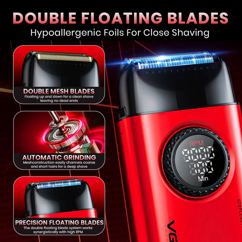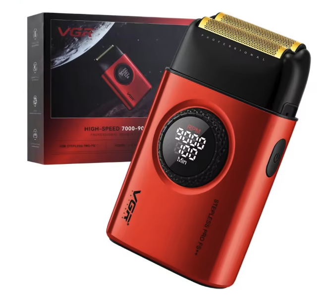 Jedinstven, prekrasan i moćan! VGR V-377 profesionalni brijač s dvostrukom mrežicom    Ovo je oprema koja će promijeniti vaš rad. Ogromna snaga od 9000 okretaja u minuti ne usporava čak ni na najtvrđoj kosi Titanske folije osiguravaju izdržljivost, dugotrajnost i izvrsno klizanje po koži, zahvaljujući čemu je brijač lako voditi po obrijanim područjima. Gumb vam omogućuje precizno podešavanje željene brzine: do 21 razine! LED zaslon prikazuje status baterije i broj okretaja Metalno kućište Uključuje četkicu za čišćenje, kutiju i USB kabel za punjenje